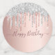 Girly and feminine confetti for your Quinceañera, 15th birthday party table setting. A rose gold faux metallic, foil looking background decorated with faux rose gold and silver glitter drips. Personalise and add a date and name/age. Dark rose gold coloured letters. Some confetti chips with name and date, others with the text: Happy Birthday written with a trendy handlettered script with swashes. Add your own photo on two of the chips.