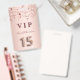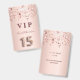 A modern, stylish and glamourous badge for a girl's Quinceañera, 15th birthday party. A faux rose gold metallic looking background with rose gold and pink sparkling stars. The name is written with a modern dark rose gold coloured hand lettered style script. With the text: VIP Number 15 is written with a balloon style font, script.