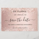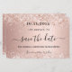 A Save the Date card for a Quinceañera, 15th birthday party. A rose gold metallic looking background decorated with faux glitter dust. Personalise and add a date and name/age. The text: Save the Date is written with a large trendy hand lettered style script with swashes.