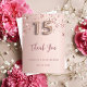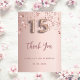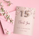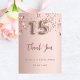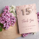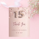 A thank you card for a Quinceañera. A rose gold gradient background colour. With rose gold dripping shining stars. On front: number 15 written with a balloon style font, large dark rose gold coloured hand lettered script and the text: Thank You, your text, title and a date.