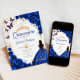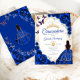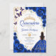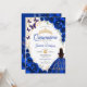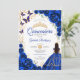 Royal blue, gold and white Quinceanera celebration invitation. Features brunette girl in ball gown dress, script font, gold butterflies, watercolor roses and tiara. Perfect for an elegant princess style glam celebration. Personalize with your own details. Printed Zazzle invitations or instant download digital printable template.