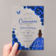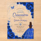 Royal blue, silver dress Quinceanera celebration acrylic invitation. Features brunette girl in ball gown dress, script font, silver butterflies, watercolor roses and tiara. Perfect for an elegant princess style glam celebration. Personalize with your own details. Stylish transparent or frosted acrylic invitations.