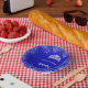A paper plate for a girly and glamourous Quinceañera, 15th birthday party. A chic royal blue background with faux silver glitter, sparkles. The text: The name is written with a large modern hand lettered style script. Personalise and add a date, name.