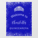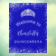 A welcome sign for a girly and glamourous Quinceañera, 15th birthday party.  A royal blue background with elegant faux silver dust and a tiara, crown.  Personalise and add a name and age.  White letters. The name is written with a modern hand lettered style script.