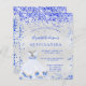 A faux silver looking background. Decorated with royal blue confetti, sparkles. Personalise and add a name and party details. The name is written with a hand lettered style script.