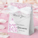 Elegant, classic, glamourous and girly for a Quinceañera, 15th birthday party favours. A faux silver looking background with pink confetti and a dress. With the text: Quinceañera and Thank You written with a modern hand lettered style script. Personalise and add a name and a date.