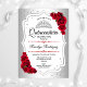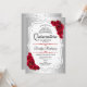 Silver white Quinceanera celebration invitation. Features script font, red roses, tiara and confetti. Classy design with faux glitter silver. Perfect for an elegant princess style glam celebration. Personalise with your own details. Printed Zazzle invitations or instant download digital printable template.