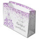 A gift bag for a girly and glamourous Quinceañera, 15th birthday. A stylish white background decorated with purple faux glitter dust. Personalise and add a date and name. The name is written with a modern hand lettered style script