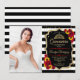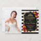 Quinceanera party invitation with your photo. Features black white stripes, script font, red roses, sunflowers, tiara and confetti. Classy black white red design with faux glitter gold. Perfect for an elegant celebration. Customise with your own details.