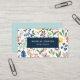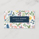 Charming business card for a home stylist, interior designer, beautician, or more with a hand drawn pattern of quirky flowers, herbs, greenery, and berries in blue, coral, pink, and yellow.