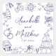 Personalised Hand-Drawn Quirky Wedding Stickers. These fun and playful square wedding stickers feature quirky doodle illustrations surrounding the design, all in a rich navy blue theme. Elements like a champagne tower, wedding cake, disco ball, hearts, wedding bells, rings, cameras, and more create a whimsical and celebratory vibe. The bride and groom's names and wedding date are elegantly displayed beneath the artwork in a mix of handwritten script and simple fonts, adding a stylish and personalised touch.