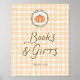 Celebrate the arrival of your little pumpkin with this cute, fall themed baby shower downloadable books and gifts sign with a charming hand drawn design featuring a cute little watercolor pumpkin, surrounded by a hand drawn frame and a soft orange gingham pattern in the background. This sign perfectly captures the warmth and cosiness of the autumn season. The warm colours and playful font will surely set the tone for a memorable and festive celebration.