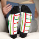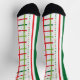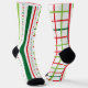 Quirky Merry Christmas socks with patterns of stripes, plaid, and dots in lime, green, and red.