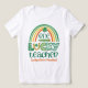Celebrate Saint Patrick's Day in style, even at school, and show your students how lucky you are to be the one teaching them at the same time with this teacher's St Patrick's Day t-shirt personalized with the name of the school or the teacher's name. The print features a whimsical rainbow in orange, yellow, and green, a drawing of a pencil, a lucky horseshoe, patterned letters, and shamrocks.