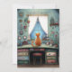 Quirky orange cat at a window illustration style image on a flat greeting card. Text can be changed to your preferred greeting. AI assisted graphic purchased with commercial use. Artwork: RedHeronLighthouse