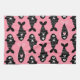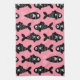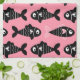 A fun and modern seamless block print style fish pattern featuring rows of black fishes on a soft pink background with occasional pops of pink tails. Ideal tea towel gift for lovers of marine life! Available in other colors