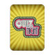 Quiz night trivia party flex magnet. With big bold typography surrounded by dressing room lights. The background is a yellow sunburst pattern.