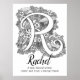 Pretty R monogram black ink drawing Zen style doodle. Art name and meaning inked doodle art poster is perfect for a girls bedroom. Personalise with your child's own name beginning with R, and name meaning for a truly personalised touch to your child's bedroom or nursery, this example is for the name Rachel A ewe. Strong willed, clever and kind, a loving friend. Choose the matt poster finish and you can colour it in or gift it to a friend who loves colouring. © Unique R monogram drawing featuring items begining with R including, running rabbits, rainbows, roses, rockets, and raspberries. Description original ink drawing and design by Sarah Trett. www.sarahtrett.com for www.mylittleeden.com