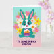 Designed with a sweet, stylized rabbit at the center, this card features a teal body with a white blaze on the face and a white belly, giving it a gentle, friendly look 🐰. The rabbit’s big eyes, tiny heart-shaped nose, and rosy cheeks suggest a tender, affectionate mood, as if it’s shyly offering a gift to someone special. Long ears with pink inner details stand upright, adding to the attentive pose. In its paws, it holds a small basket with purple-and-white stripes, filled with smooth orange egg shapes that feel like a shared springtime find 🐇. A ring of flowers frames the character, mixing pastel pink, sunny yellow, and soft white petals with orange centers, threaded with light green leaves. Behind everything, the background fades in a vertical gradient from aqua at the top to blush pink near the bottom, keeping the scene airy and soft. Near the lower portion, friendly purple text is placed prominently, standing out clearly against the lighter backdrop. The floral wreath circles the rabbit evenly, with blossoms and leaves spaced all around like a gentle halo.
