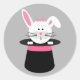 A sticker featuring an illustration of a rabbit peeking out of a tophat with pink bow on its head. Look for matching birthday invitations at Jill's Paperie.