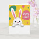 This card features a white, human-like rabbit leaning over a white horizontal ledge, as if it’s shyly greeting someone special 🐰. Its long ears have rosy pink inner details, and a small pink nose sits above a gentle smile that suggests friendly affection. Glossy black eyes and fine white whiskers add to the tender, attentive look, like it’s waiting for a warm reply. The background is a sunny yellow field that feels bright and inviting, with soft-edged abstract shapes scattered in deep green and rich pink for contrast. On the right side, a pink speech bubble holds the words “Happy Easter” in dark lettering, centered neatly inside the bubble. The rabbit’s small rounded paws rest on the ledge, gripping the edge as though it’s peeking up to share a quiet moment 🌷. Behind it all, the yellow backdrop is dotted with rounded green and pink shapes that float around the speech bubble.