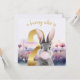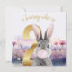 Gray rabbit blowing a pink bubble gum in a field of wildflowers