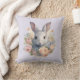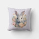 A pillow with a sweet and adorable watercolor image. A bunny rabbit with white and gray fur. A garland of carnation flowers in pastel colors of pink and peach. A cute Easter, birthday or baby shower image for bunny rabbit lovers.