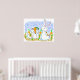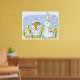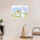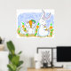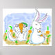 A cute illustration of two happy white rabbits munching on carrots in a field. The watercolor-like background makes this picture look like it belongs on the cover of a children's book. This poster print would look great in a child's bedroom or nursery.