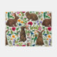 Hand-drawn rabbits and woodland flora, ferns mushrooms and beriies and bugs