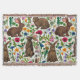 Hand-drawn rabbits and woodland flora, ferns mushrooms and beriies and bugs