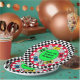 Boy's birthday with race cars and tracks, chequered background birthday party paper plates.