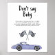 Race car theme baby shower invitation card featuring watercolor illustrations of a purple (violet) vintage car and black - white race flag. "Race on over for a baby shower."