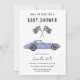 Race car theme baby shower invitation card featuring watercolor illustrations of a purple (violet) vintage car and black - white race flag.