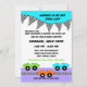 Adorable Race car theme baby shower invitation in fun neutral colours of bright aqua blue, purple and orange with black and white chequered flag bunting and colourful race cars.