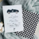 Race car baby shower invitation in a minimalist style with a blue race car and cars pattern on back. You can personalise this invitation with your own details under the "Personalise this template" section.