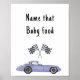 Race car theme baby shower invitation card featuring watercolor illustrations of a purple (violet) vintage car and black - white race flag. "Race on over for a baby shower."