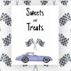 Race car theme baby shower invitation card featuring watercolor illustrations of a purple (violet) vintage car and black - white race flag. "Race on over for a baby shower."
