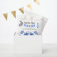 Race car theme baby shower invitation card featuring watercolor illustrations of a blue race car.