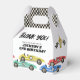 Boy racing car birthday party favour boxes featuring watercolor race cars, chequered flags, a trophy, and a thank you template that is easy to customise.