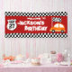 This car race themed birthday design is a thrilling and exciting design for kids who love cars and racing. The chequered flags along with bold typography and combination of red, white and black colours create this design visually appealing and engaging. This design can be a memorable and fun experience for your party guests.