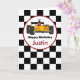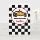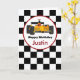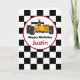 Racing theme birthday card for that special little hot rod featuring a sporty yellow race car in a white winners circle outlined in red with a black and white chequered background ... a great birthday choice for any boy or girl who loves cars and racing. Personalise with child's name.