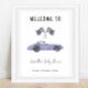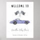 Race car theme baby shower invitation card featuring watercolor illustrations of a purple (violet) vintage car and black - white race flag.