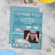 Racing cars and finish racing flags photo birthday thank you card for boys. The design has blue-washed watercolor stripes. Add your message, name and photo and make a cute birthday thank you card for the guests.