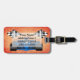 Stand out in the baggage carousel with a Racing Car Luggage Tag that features a fiery orange gradient background, a blue race car with flames coming off the tires, black and white chequered racing flags. Text is set up for your name, address and phone number or any text you want. Perfect gift for the racer in your life. Leather luggage strap included.