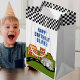 Racing Car Road House Name Happy Birthday Gift Bag. A car racing theme - a simple car with an age number on a road with houses and trees. Add your name and age number.