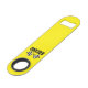 Bottle opener is shown in a bright yellow colour with a racing flag print.