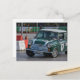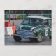 A great picture of a sporting racing green classic mini cooper car on a postcard.