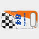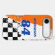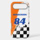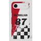 Add a name and number(s) to personalize this custom racing inspired phone case. The background features blue to the left and a white splash of paint design that sits above a black and white checkered pattern. The text is blue with the option to add a text stroke for outlines. It is an excellent gift for a racing fan or race car driver. The options to change the text's colors and font sizes are available.