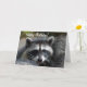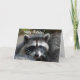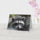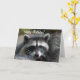 This juvenile racoon bandit looks up from his lunch, mouth still open, to wish you happy birthday. The photograph shows a close-up of his face snuggled between the furry grey sides of his mother and sibling. The little dark eyes twinkle out at you from the black mask that runs across his face, with white whiskers, like a cat's, standing out against the black. White stripes show above and below the eyes, and the black nose starts a vertical black stripe running up the forehead to the black head. His little black ears are outlined in white. One little dark forepaw, just like a hand, is at his mouth ready to pop in a bit of cat food. Against the blurred background are written the words, "Happy Birthday!" in white script. He and his family of Mum and two siblings have come for a hand-out at my sister's house in Ocean Shores, WA. Copyright Gail Storrs 2011.