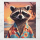 Funny Racoon wearing a hawaiian shirt on a beautiful beach.